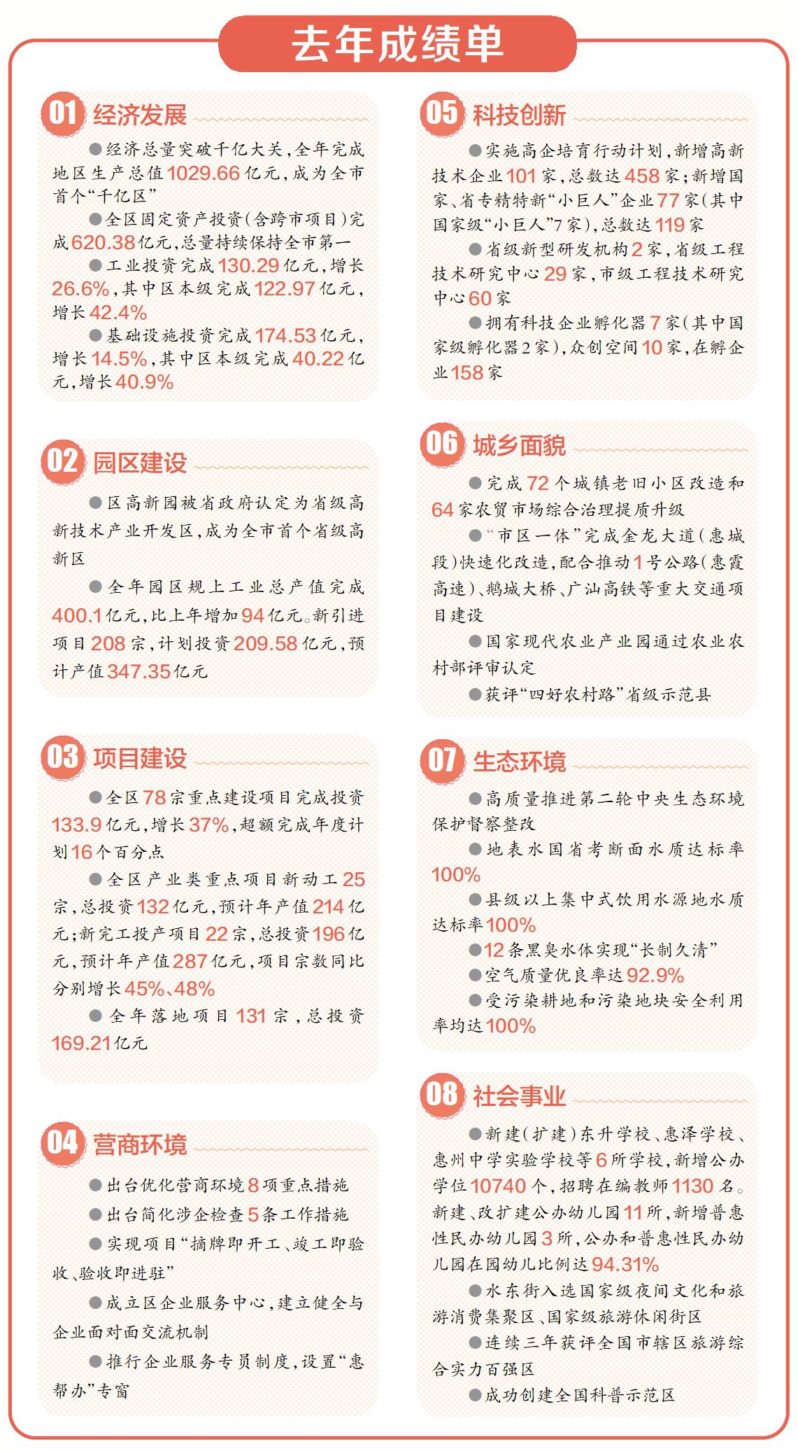 今年是全面貫徹落實黨的二十大精神的開局之年,也是歷經疫情考驗后推動高質量振興發展的關鍵之年。報告提出,惠城區要進一步堅定“市區一體”理念,繼續堅持“強平臺、抓項目、提質效”經濟工作主軸,經濟發展的預期目標是全區生產總值增長7%,居民人均可支配收入增長與地區生產總值增長基本同步,固定資產投資增長10%以上,規模以上工業增加值增長15%以上,工業投資增長25%以上,社會消費品零售總額增長8%以上。