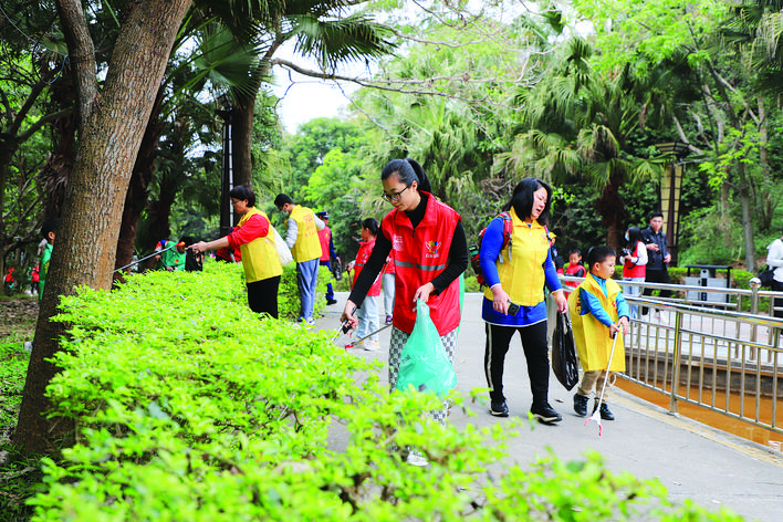 志愿者在東山森林公園撿拾垃圾。
