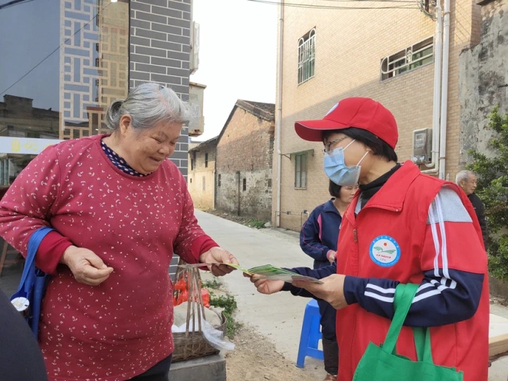 惠州市惠城區仍圖中學師生志愿者為居民發放垃圾分類宣傳冊。
